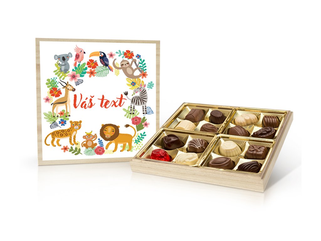 Dětské motivy – výběr belgických pralinek 200 g v dřevěné dóze (s vlastním textem)