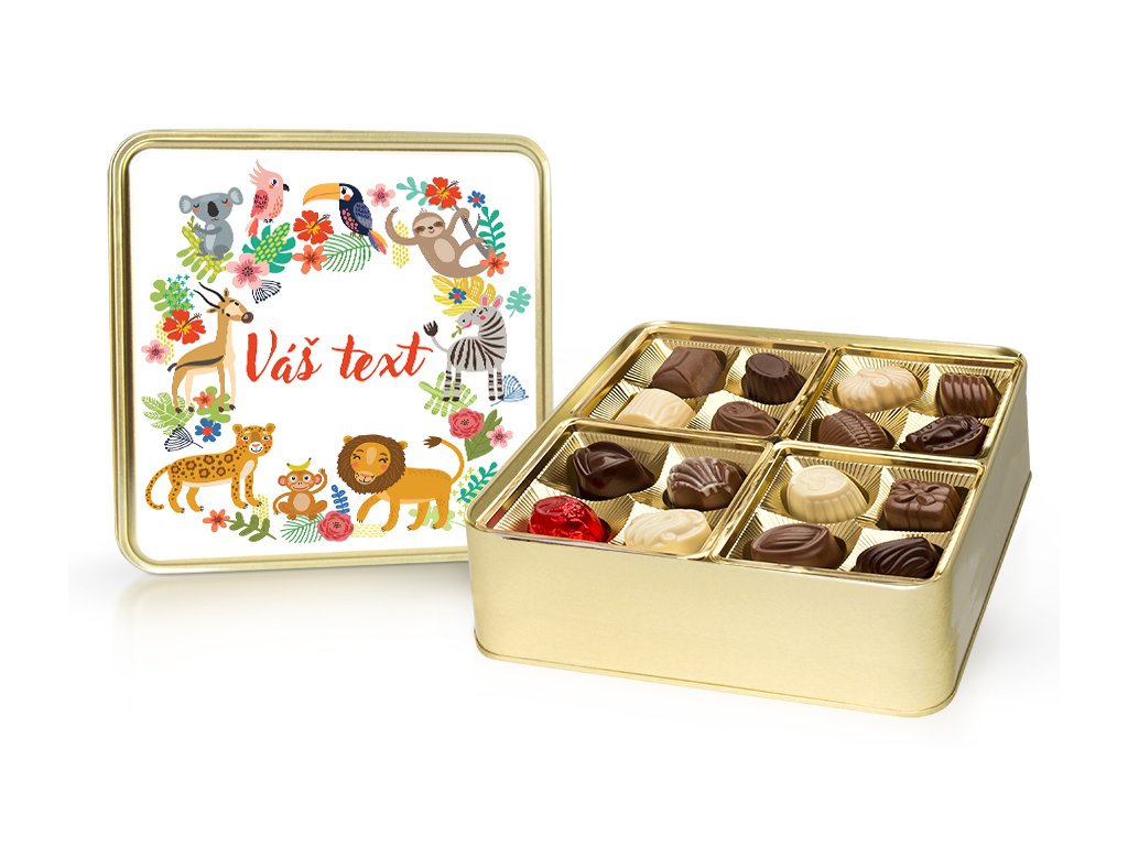 Dětské motivy – výběr belgických pralinek 400 g v plechové dóze (s vlastním textem)