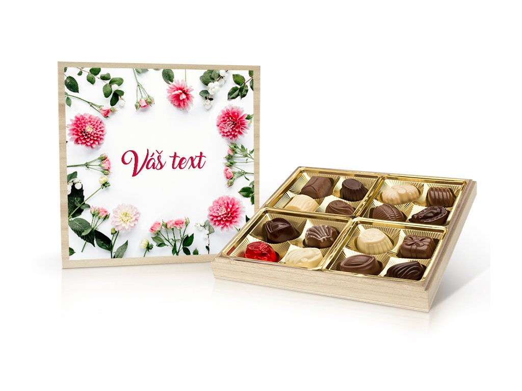 Květiny – výběr belgických pralinek 200 g v dřevěné dóze (s vlastním textem)