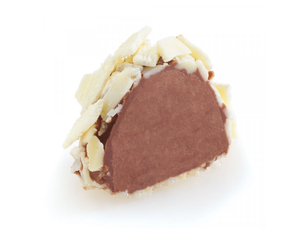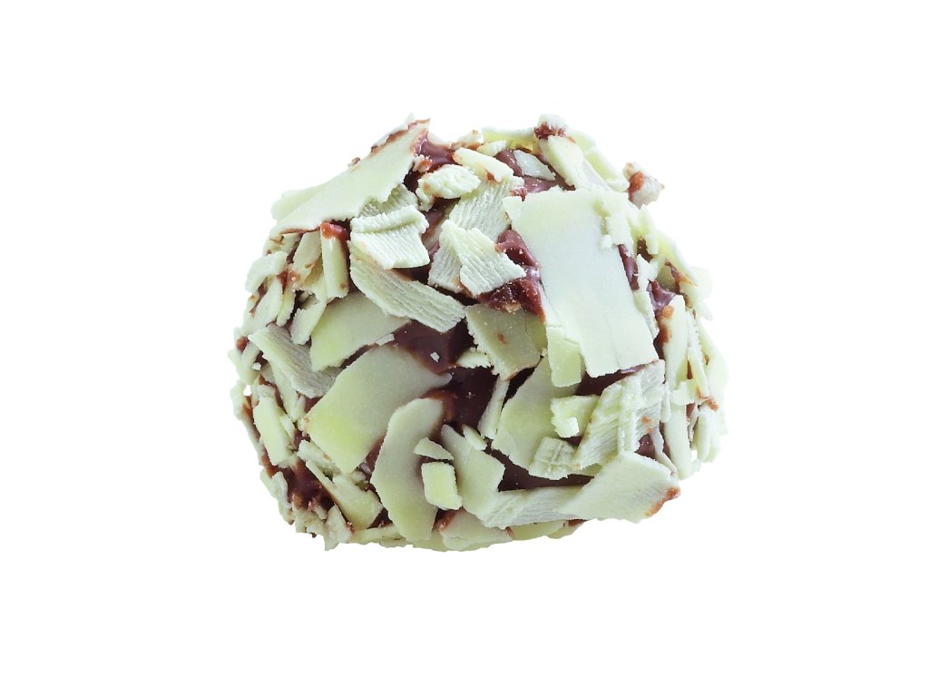 Velmi kvalitní belgické mléčné čokoládové lanýže s vločkami z bílé čokolády s příchutí cappuccino v dárkové tašce
