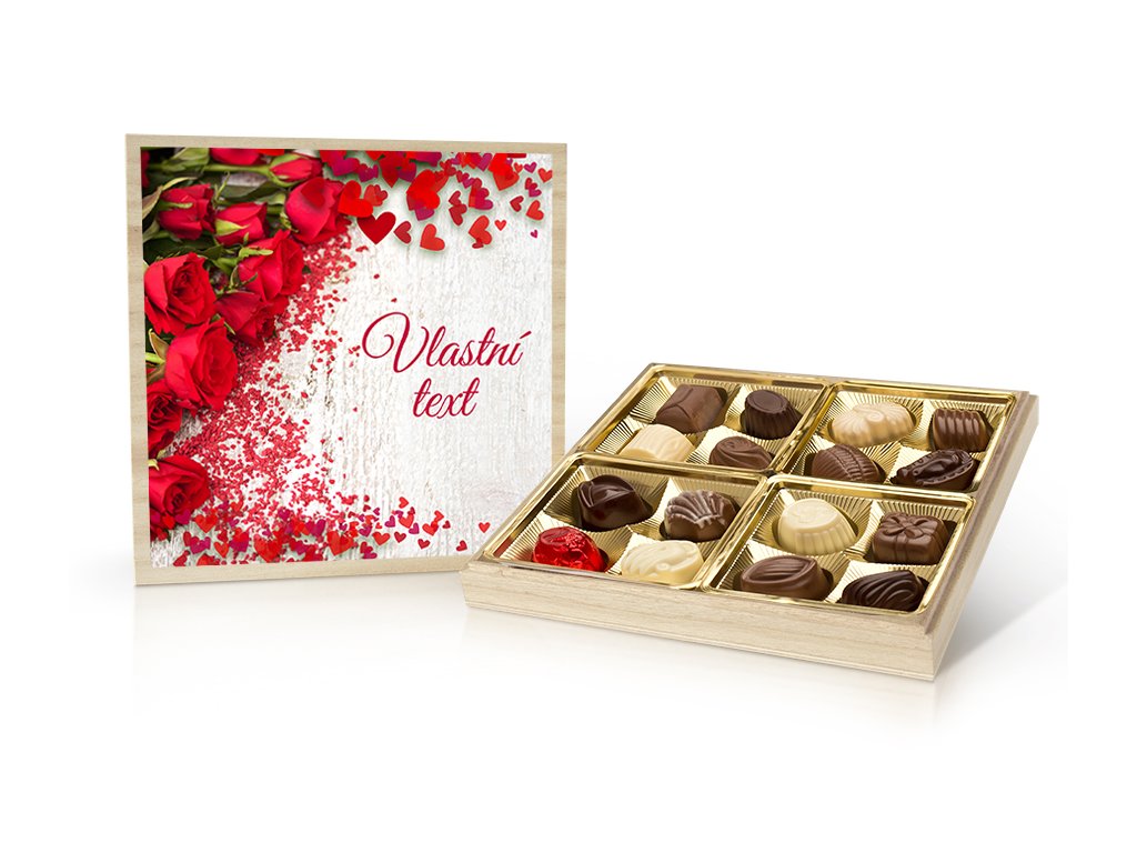 Srdce – výběr belgických pralinek 200 g v dřevěné dóze (s vlastním textem)