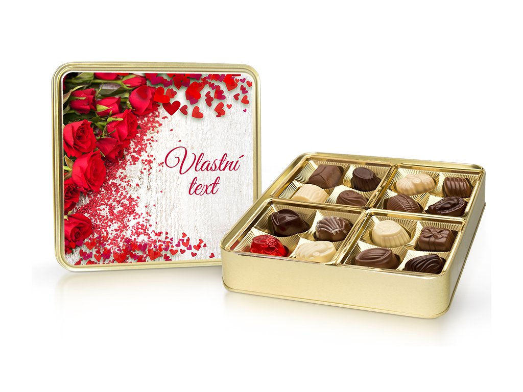 Srdce – výběr belgických pralinek 200 g v plechové dóze (s vlastním textem)