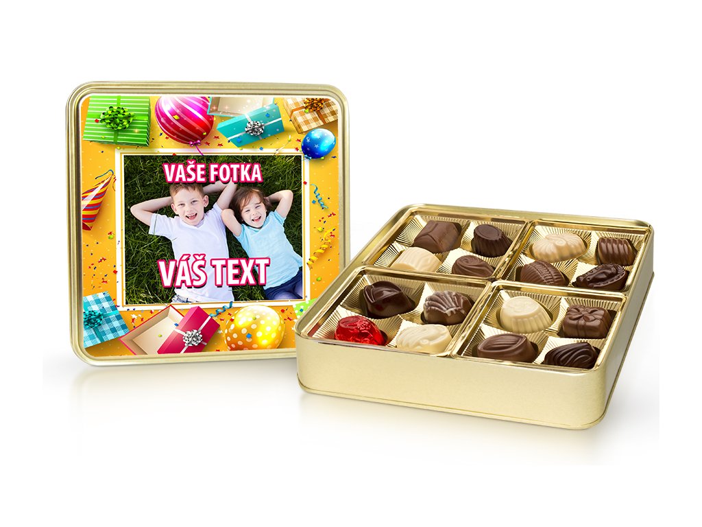 Vložená vlastní fotka – výběr belgických pralinek 200 g v plechové dóze (s vlastním textem)
