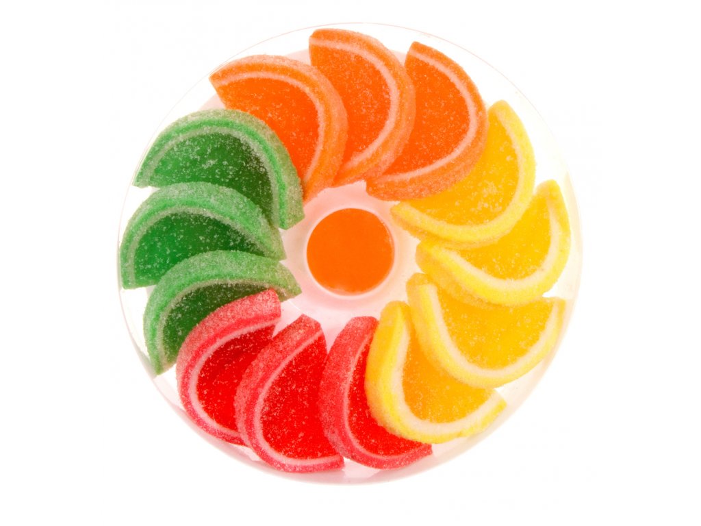Zloženie: cukor, glukózový sirup, voda, regulátor kyslosti E330, želírujúca látka E406, sušený vaječný bielok, arómy, farbivá E100, E160c, E163.